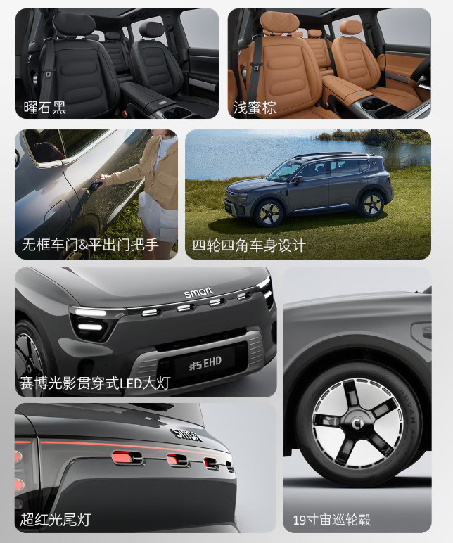 车内采用 Nappa 真皮、256 色氛围灯、20 扬森海塞尔典范音响系统、AMD 5 屏智能互联座舱,搭载 AMD V2000 桌面级芯片。