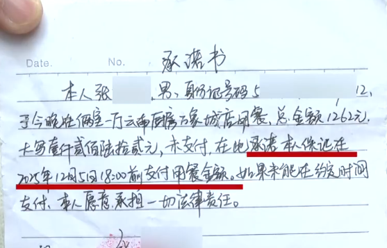 餐馆老板报了警,民警跟所谓组局者打了电话,对方表示他也没钱,要筹钱。在民警协调下,张先生写了承诺书,押下身份证,答应次日18点前结账。